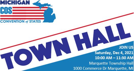 The Convention of States town hall meeting is set for this Saturday, December 4th, at 10:00 am at the Marquette Township Hall, and all are welcome to attend.