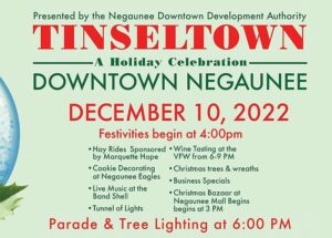 Marquette, MI – December 8, 2022 – The Negaunee Downtown Development Authority is excited to announce the return of Tinseltown, “A Holiday Celebration” this Saturday from 4:00pm to 8:00pm in downtown Negaunee.